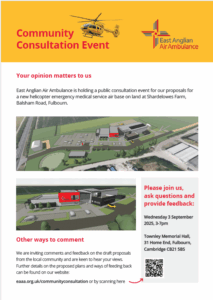 East Anglian Air Ambulance Community Consultation taking place this afternoon/evening from 3-7pm at the Townley Memorial Hall. Your chance to ask staff any questions about the proposed air base at Shardelowes Farm, Balsham Road, Fulbourn.